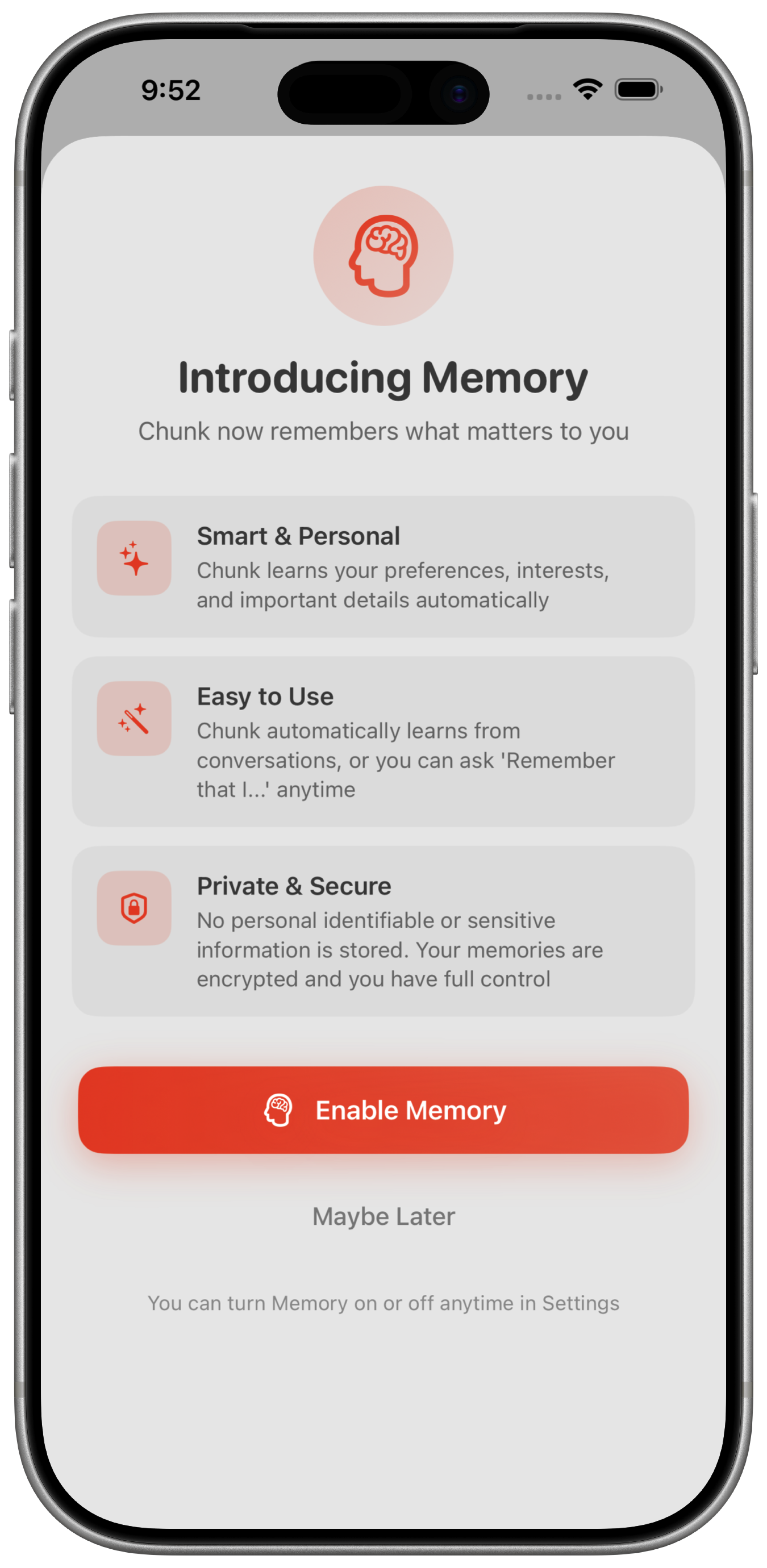 Chunk now remembers what matters to you. Memory automatically learns your preferences, interests, and important details from your conversations—making every interaction more personalized and helpful over time.